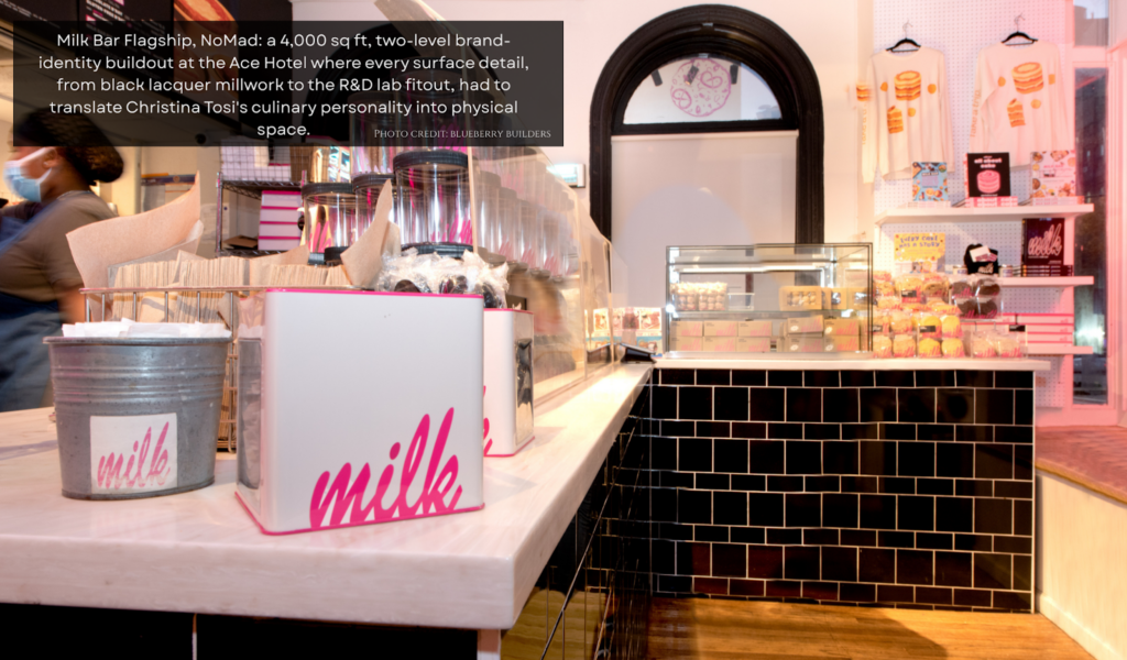 The Milk Bar Flagship at 1196 Broadway in NoMad is one of the more technically specific briefs in the Blueberry Builders portfolio, because the construction challenge here was not purely about scale or regulatory complexity.